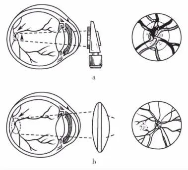 直接檢眼鏡(a)與間接檢眼鏡(b)成像原理的比較